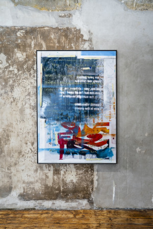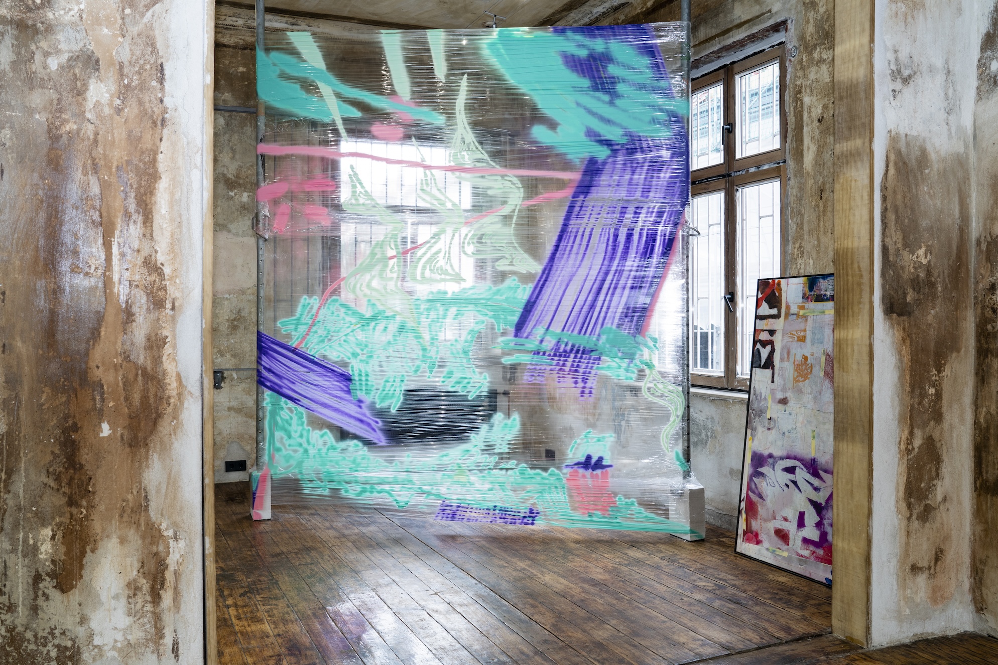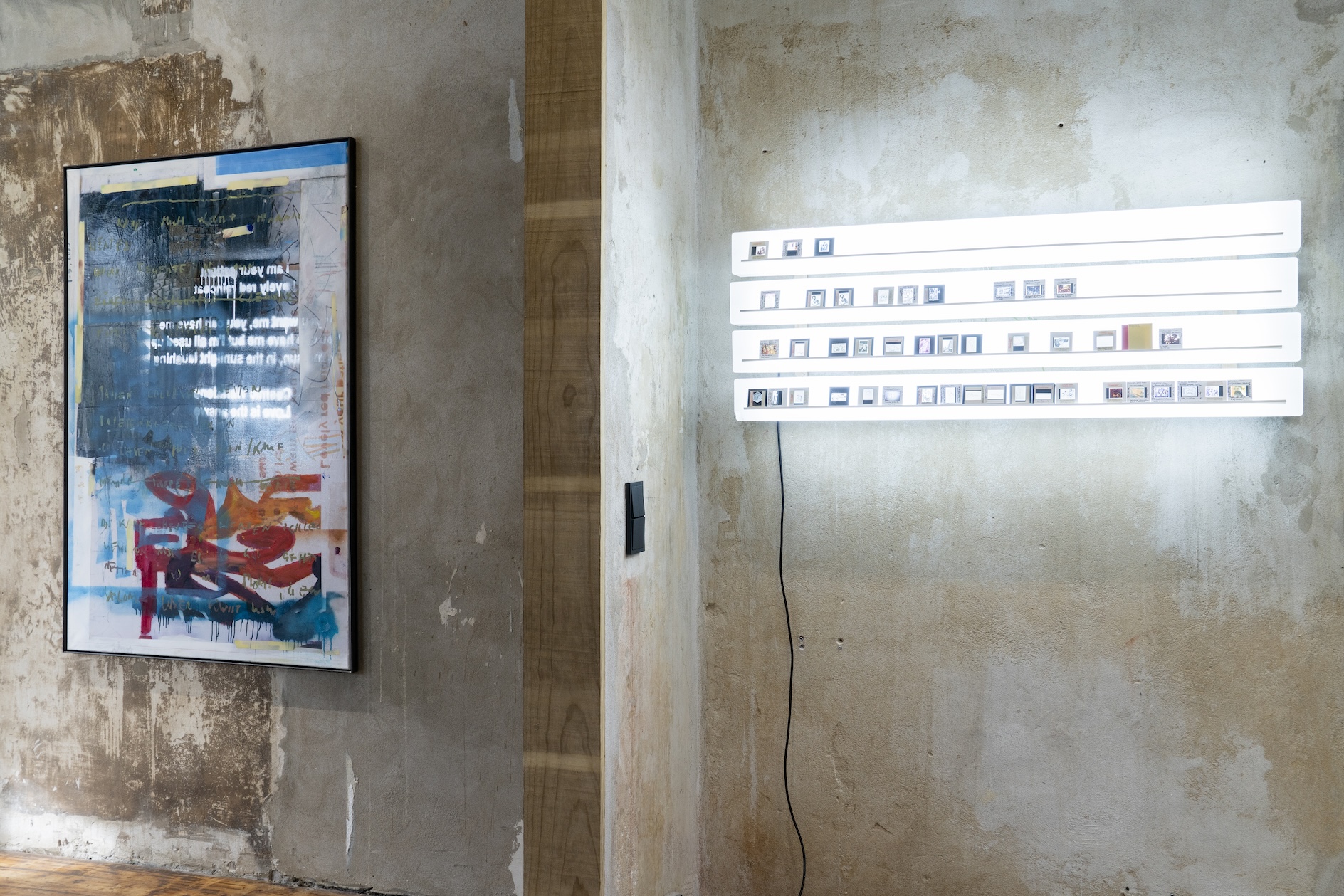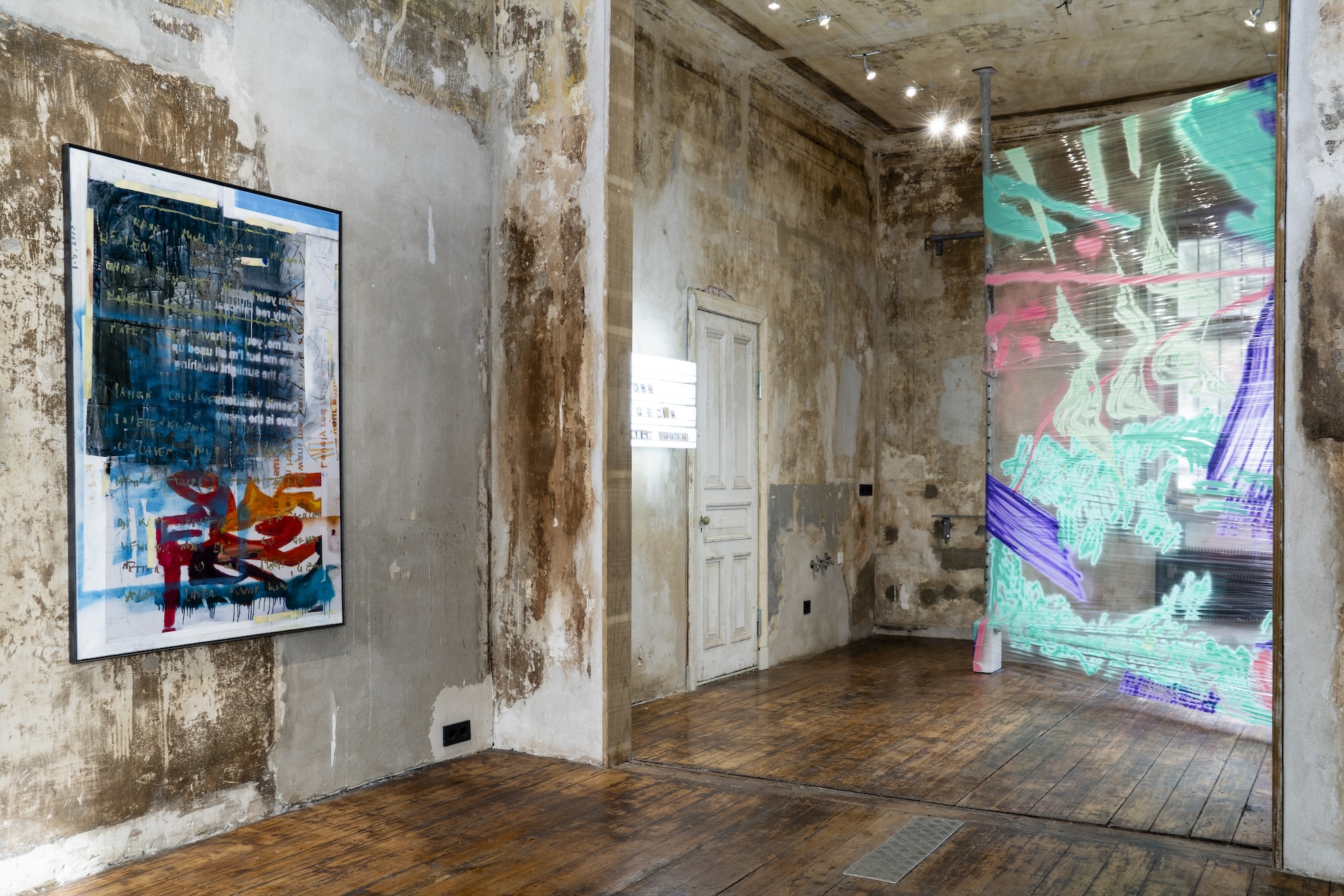 Die Ambivalenz dieses Restes spiegelt einen dialektischen Prozess, in dem das Werk sich immer wieder selbst erzeugt, erhält, und zugleich doch stets in Auflösung begriffen ist. Gilt es, Schicht um Schicht des Definitorischen abzuschälen, um zu diesem Rest vorzudringen? Oder zeigt er sich dann, fliehend, wenn die Konstellationen es erlauben? Max Brück öffnet in seiner „Diathek“ die Ordnung von Vergangenem im Medium Fotografie und bricht mit der vermeintlichen Deutungshoheit des historischen Archivs. In Abhängigkeit des Lichteinfalls im Raum entstehen immer neue zeitliche Überlappungen und Verdichtungen. Die vor Ort, kurz vor Eröffnung der Ausstellung entstandene, performative Malerei von Timofej Kratz fungiert als Scharnier zwischen dem Akt ihrer Entstehung und dem sich öffnenden Raum der Veräußerung. Sie verweist so auf den konkreten Prozess des Schaffens, ist Zeuge einer Verwandlung und zugleich Autogenese. Ähnliches geschieht auch bei Johannes Listewnik. Er zeigt einen Ansatz, der klassische malerische Stilmittel mit Textfragmenten konvergieren lässt. Das Material wird zum Zeugen einer stetig fortschreitenden Erzählung, die Farbschichten zum Zeit- und Gedanken-Container.