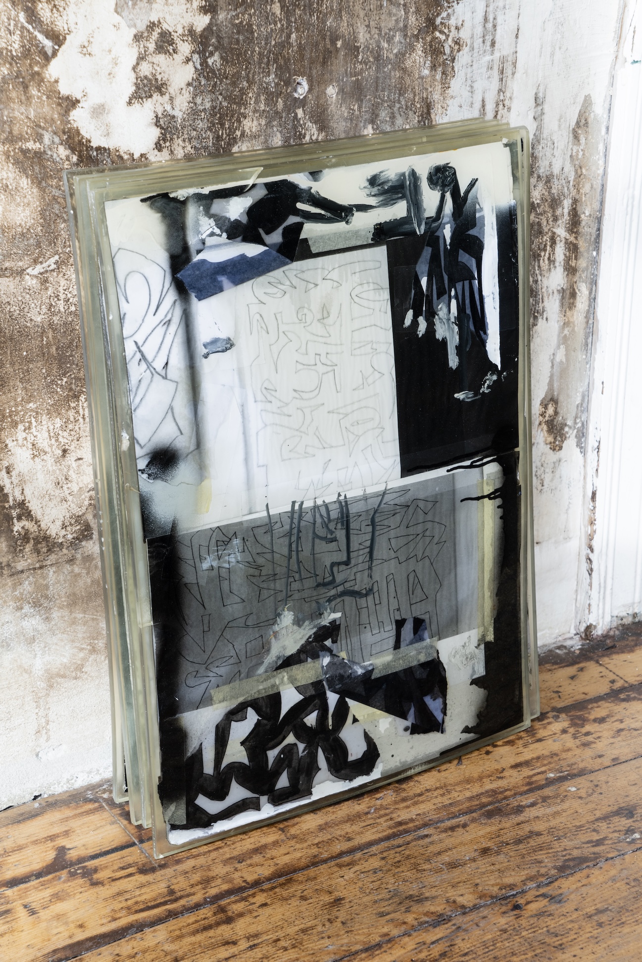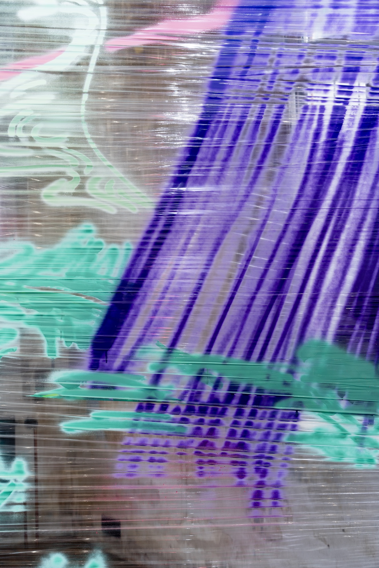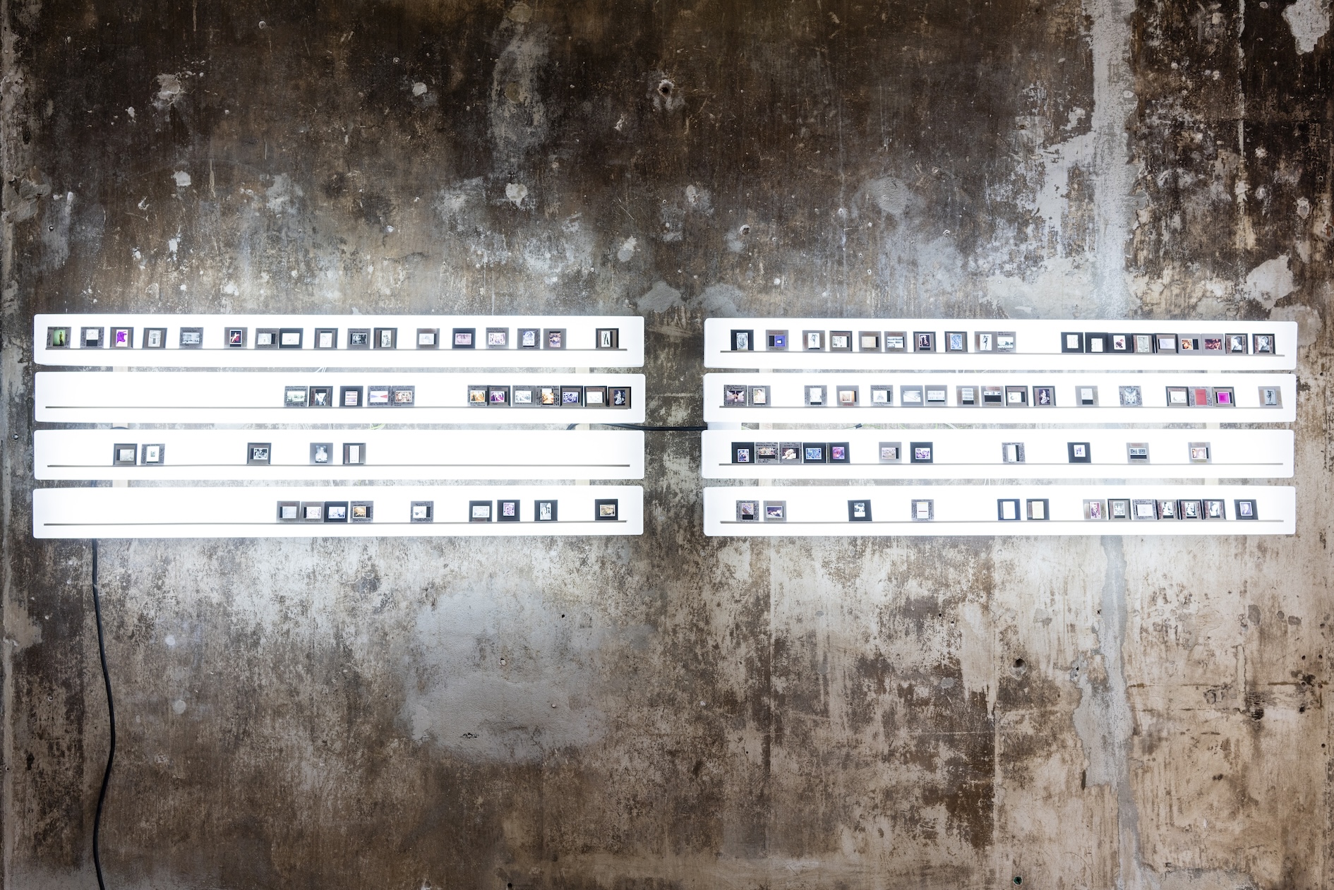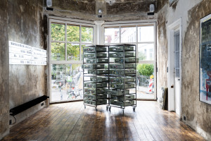 Die Ambivalenz dieses Restes spiegelt einen dialektischen Prozess, in dem das Werk sich immer wieder selbst erzeugt, erhält, und zugleich doch stets in Auflösung begriffen ist. Gilt es, Schicht um Schicht des Definitorischen abzuschälen, um zu diesem Rest vorzudringen? Oder zeigt er sich dann, fliehend, wenn die Konstellationen es erlauben? Max Brück öffnet in seiner „Diathek“ die Ordnung von Vergangenem im Medium Fotografie und bricht mit der vermeintlichen Deutungshoheit des historischen Archivs. In Abhängigkeit des Lichteinfalls im Raum entstehen immer neue zeitliche Überlappungen und Verdichtungen. Die vor Ort, kurz vor Eröffnung der Ausstellung entstandene, performative Malerei von Timofej Kratz fungiert als Scharnier zwischen dem Akt ihrer Entstehung und dem sich öffnenden Raum der Veräußerung. Sie verweist so auf den konkreten Prozess des Schaffens, ist Zeuge einer Verwandlung und zugleich Autogenese. Ähnliches geschieht auch bei Johannes Listewnik. Er zeigt einen Ansatz, der klassische malerische Stilmittel mit Textfragmenten konvergieren lässt. Das Material wird zum Zeugen einer stetig fortschreitenden Erzählung, die Farbschichten zum Zeit- und Gedanken-Container.
